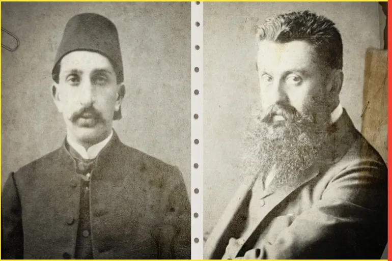 Herzl (kanan) berhasil, setelah melalui perantaraan, bertemu Sultan Abdul Hamid pada 18 Mei 1901. Herzl mencatat pertemuan ini dalam memoarnya.