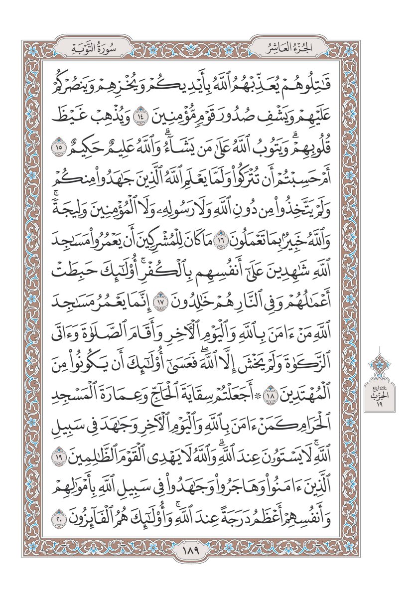 19. Apakah (orang-orang) yang memberi minuman orang-orang yang mengerjakan haji dan mengurus Masjidilharam kamu samakan dengan orang-orang yang beriman kepada Allah dan hari kemudian serta bejihad di jalan Allah? Mereka tidak sama di sisi Allah; dan Allah tidak memberi petunjuk kepada kaum yang zalim.